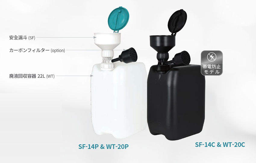 - 帯電防止用漏斗(別売)と組合せて、廃液回収システムとしてお使い頂けます。